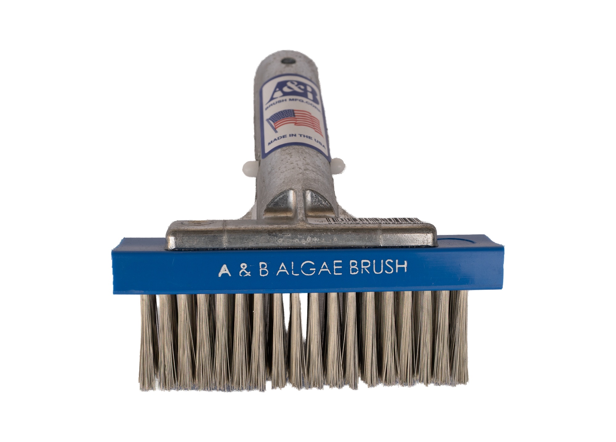 3.5" algae brush with 2 offset rows of crimped stainless steel bristle, blue back, and aluminum Kwik-fit handle.