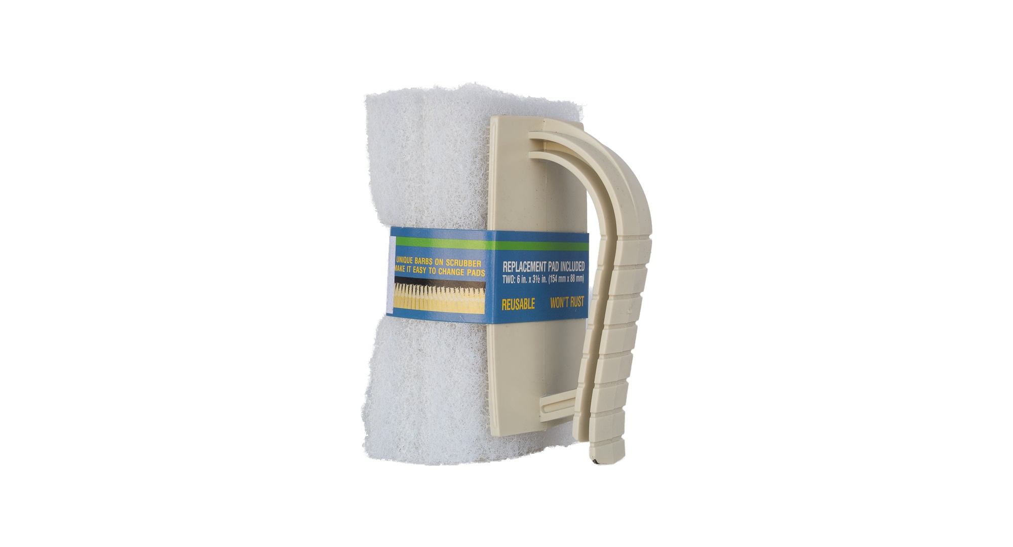 Compact hand-held scrubber with two white cleaning pads. Retail packaged.