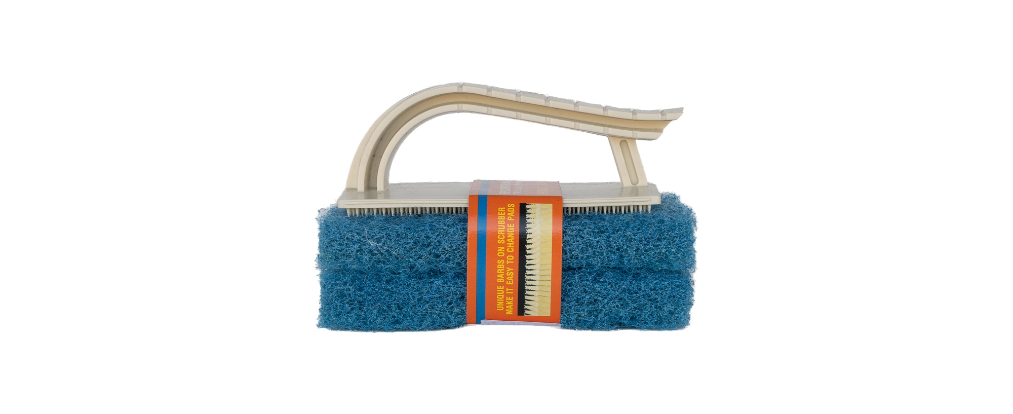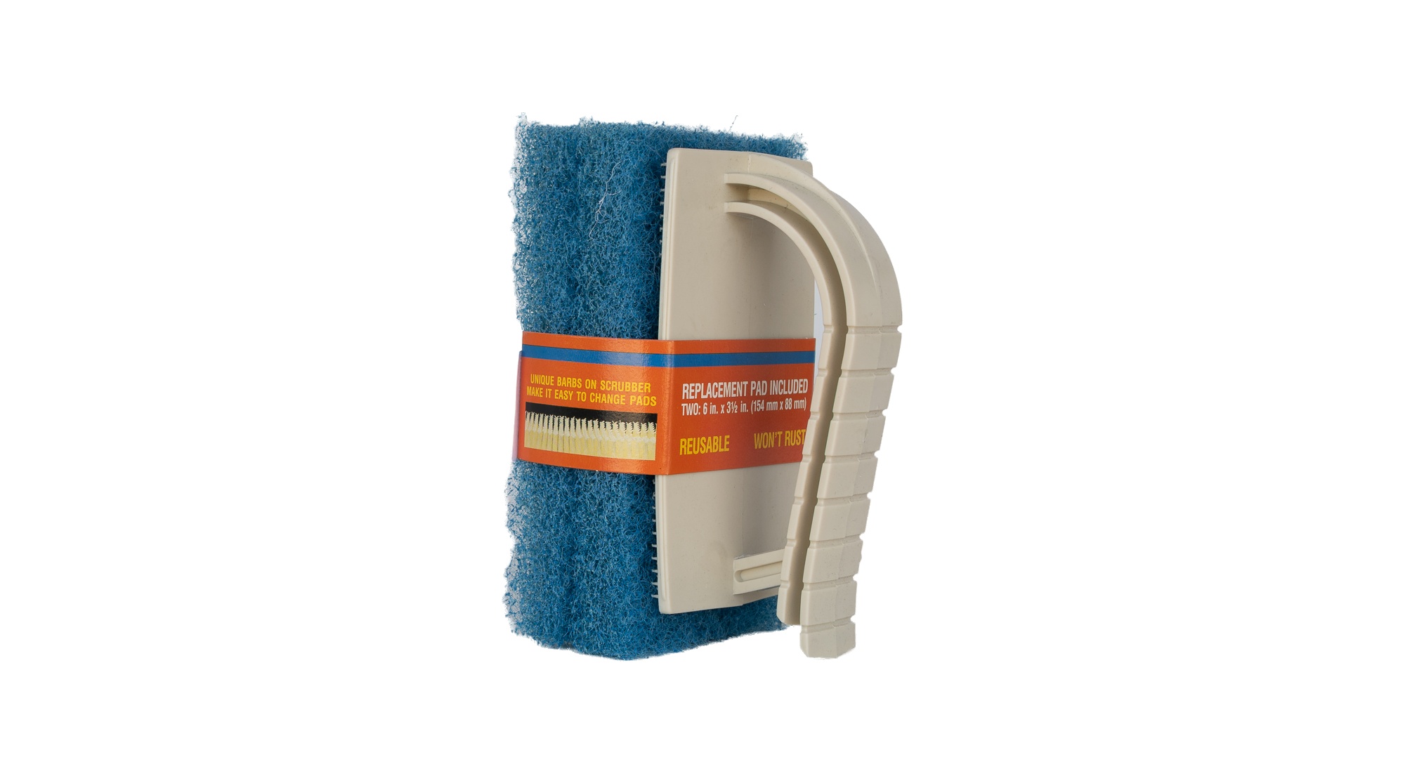 Compact hand-held scrubber with two blue cleaning pads. Retail packaged.